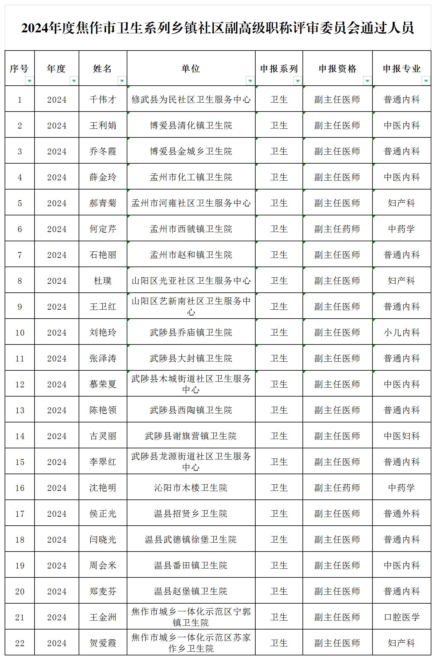 根据全市职称工作安排,通过个人申报、单位推荐、主管部门或市辖县区人力资源社会保障部门资格审查、评委会承办部门复核,经焦作市卫生系列乡镇社区副高级职称评审委员会组织专家评审,22名同志通过评审。现将评审通过人员公示如下,请予监督。如对公示人员有问题反映,请于公示期以书面形式反馈我们。