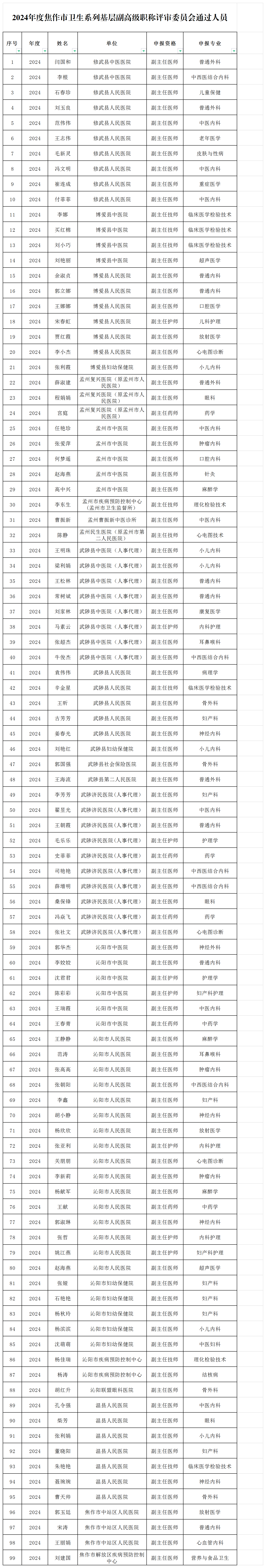 关于2024年度焦作市卫生系列基层副高级职称评审委员会通过人员的公示